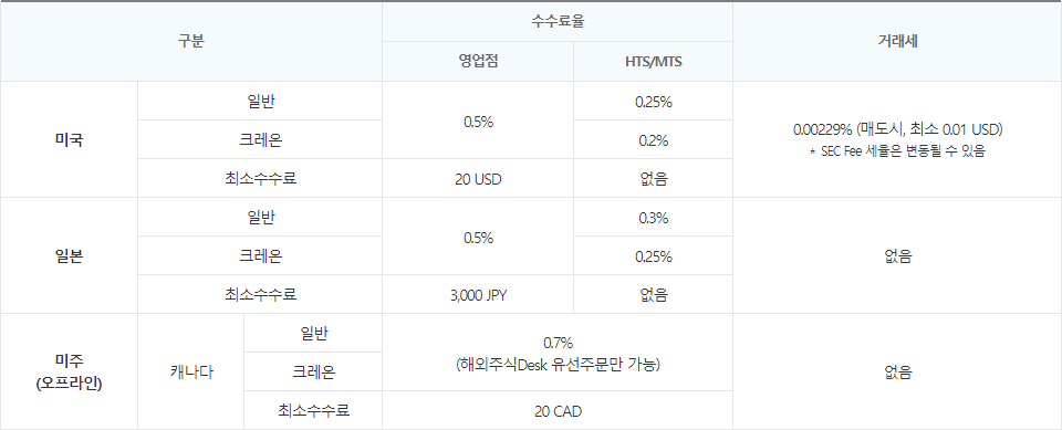 캐나다 주식은 오프라인 영업점 '해외주식Desk 유선주문'만 가능하고, 최소수수료 20 CAD에 거래세는 없습니다. 일본 주식은 영업점에서는 '0.5%' 또는 '3,000JPY'의 최소 수수료가 부과되고, 홈페이지에서는 '0.3%', HTS와 MTS를 이용하는 경우에는 수수료가 0.25%이고, 별도의 거래세는 없습니다.
