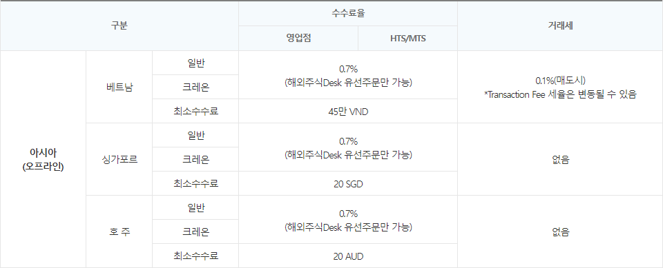 대신증권에서 싱가포르와 베트남 및 호주 주식을 거래는 오프라인 영업점 '해외주식Desk 유선주문'만 가능하고, 공통적으로 수수료율은 '0.7%'에 최소 수수료는 싱가포르 '20 SGD', 베트남 '45만 VND', 호주는 '20 AUD' 입니다. 싱가포르와 호주의 경우 별도의 거래세는 없으며, 베트남은 매도 시 거래세가 '0.1%' 인데, Transaction Fee 세율은 변동될 수 있습니다.