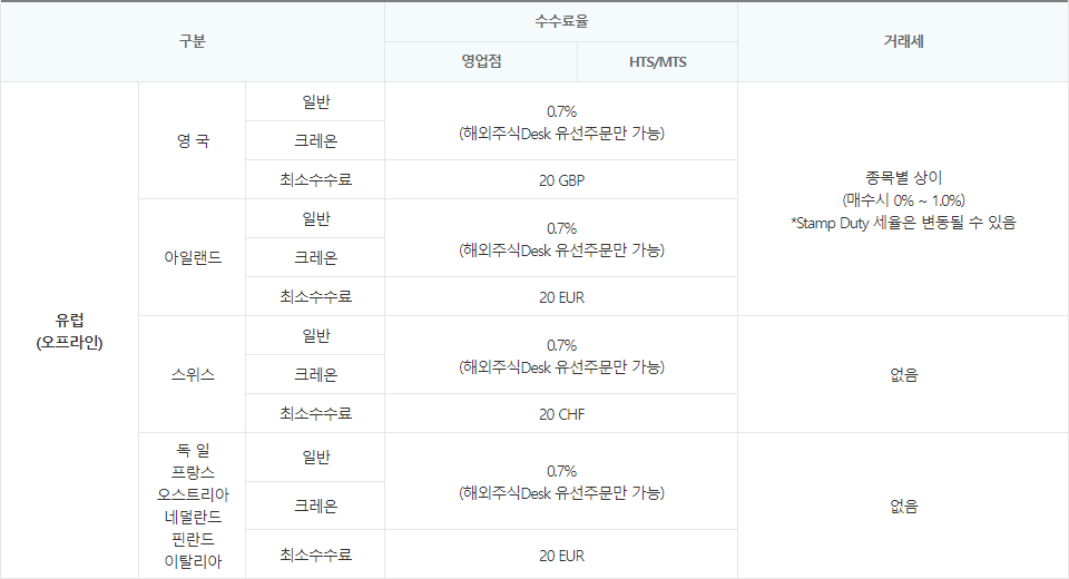 독일과 프랑스, 이탈리아와 네덜란드, 오스트리아와 핀란드는 최소 수수료 '20 EUR', 스위스는 '20 CHF'로, 공통적으로 별도의 거래세는 없습니다. 참고로, 국가별 매매수수료는 종목별 및 매수·매도별로 각각 부과되고, 대신증권 영업점에서 오프라인 주문시 최저수수료로 인해 주문거부 및 미수가 발생할 수도 있는데, 미수발생시에는 변제 의무가 있습니다.