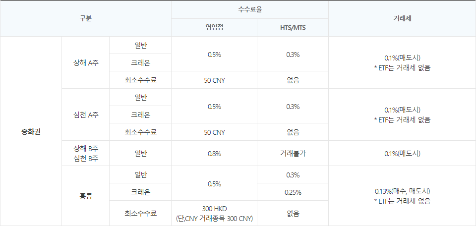 중국 내국인 전용인 상해B와 심천B 주식은 영업점에서만 거래할 수 있으며, 수수료 '0.8%'에 매도시 거래세는 '0.1%', 홍콩 주식은 영업점에서는 수수료 '0.5%'에 거래 종목에 따라 '300 HKD' 또는 '300 CNY'의 최소 수수료가 있으며, 이와 함께 ETF를 제외 한 주식 매수와 매도 시 각각 '0.13%'의 거래세가 발생 합니다.
