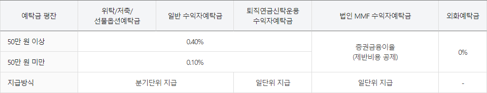 삼성증권의 예탁금 이용료는 위탁과 저축 및 선물옵션예탁금, 일반 수익자예탁금은 에탁금 평잔 50만원 미만은 연 0.1%, 50만원 이상은 연 0.4%으로, 분기 단위로 이용료를 지급하고, 퇴직연금신탁운용 수익자예탁금의 예탁금 평잔 50만원 미만은 연 0.1%, 50만원 이상은 연 0.4%로 이자율은 동일하지만, 일 단위로 지급하는 차이가 있습니다.