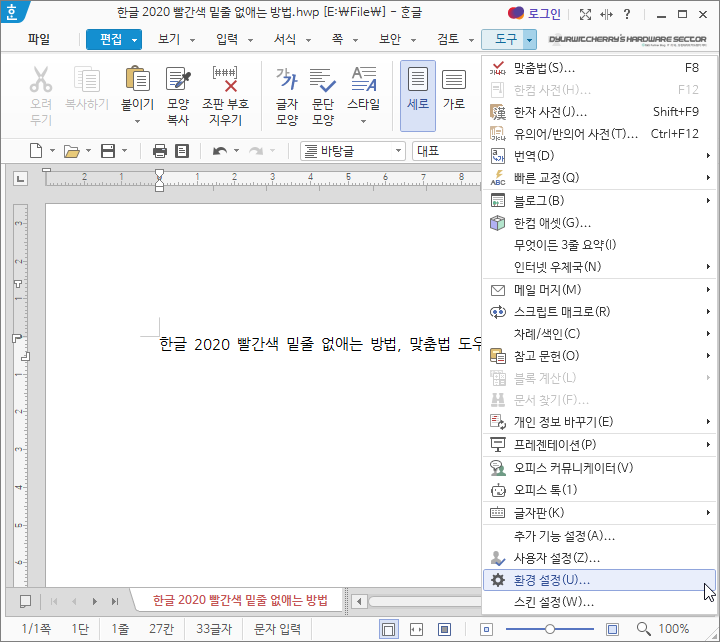 한컴오피스 2020의 한글 빨간색 밑줄 없애는 방법은 먼저, 한글 프로그램 상단 메뉴 중 '도구 - ☼ 환경설정(U)'을 클릭합니다. 참고로 포스팅 작성은 한글 2020 버전을 기준으로 작성하는 것으로, 한컴오피스 2022나 2018, NEO, 2014, 2010, 2007, 2002 등 최신 버전이나 구버전의 한글 프로그램에서도 동일하게 '맞춤법 도우미' 설정을 해제할 수 있습니다.