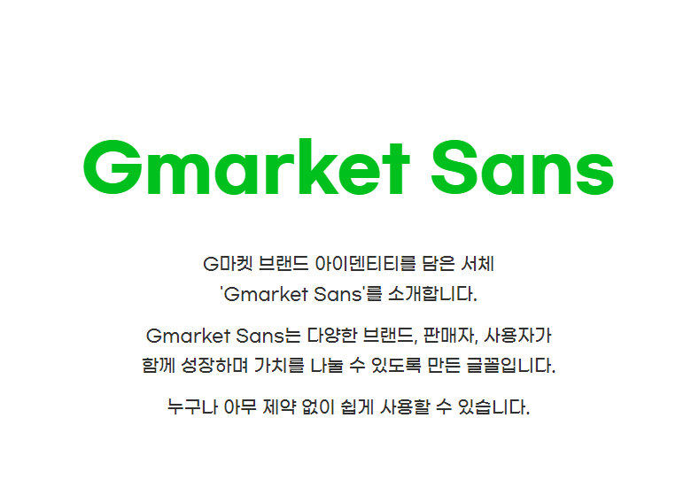 무료 폰트인 G마켓 산스 폰트 다운로드 페이지에서는 'G마켓 브랜드 아이덴티티를 담은 서체 'Gmarket Sans'를 소개합니다. Gmarket Sans는 다양한 브랜드, 판매자, 사용자가 함께 성장하며 가치를 나눌 수 있도록 만든 글꼴입니다. 누구나 아무 제약 없이 쉽게 사용할 수 있습니다.'라고 소개하고 있습니다.