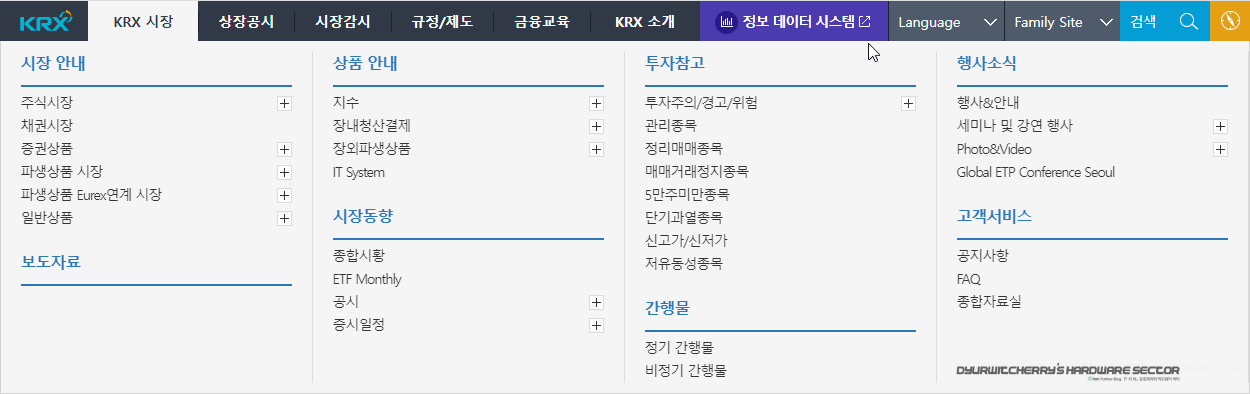 한국거래소에서 공매도 과열종목 조회를 하기위해서는 먼저 '한국거래소(KRX)' 홈페이지 상단 메뉴 중 '정보 데이터 시스템'을 클릭합니다. 참고로 KRX 홈페이지에서는 코스피와 코스닥 및 코넥스 등 국내 주식시장에 상장되어 있는 주식 종목에 대한 정보화 함께 채권 시장과 파생상품 시장, 증권상품 등의 정보를 확인 할 수 있습니다.