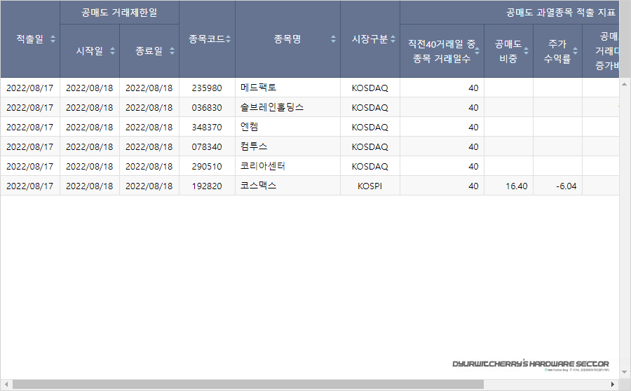 한국거래소 공매도 과열종목으로 등록되어 공매도 거래제한이 되어 있는 종목은 포스팅 작성일 기준으로 메드팩토(235980)와 솔브레인홀딩스(036830) 엔켐(348370)과 컴투스(078340), 코리아센터(290510)와 코스맥스(192820)가 신규로 등록되었으며, 유가증권시장의 코스맥스를 제외하면 모두 코스닥 시장에 상장되어 있는 종목입니다.