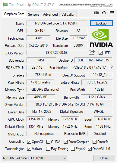 테크파워업의 그패픽카드 정보 확인 프로그램 GPU-Z 2.47 버전은 2022년 07월 22일에 릴리즈되어 포스팅 작성일 기준으로는 최신 버전으로, NVIDIA GeForce GTX 1630, RTX 3050 Laptop, MX570, A1000, A2000, A3000 12 GB, T400, T500, T550, T600, T1000, T1200과 Radeon RX 6700 non-XT 지원 이외에 구형 그래픽카드인 NVIDIA GeForce 7800 GS AGP 모델의 정보도 정확하게 확인 할 수 있는 기능이 추가 되었습니다.