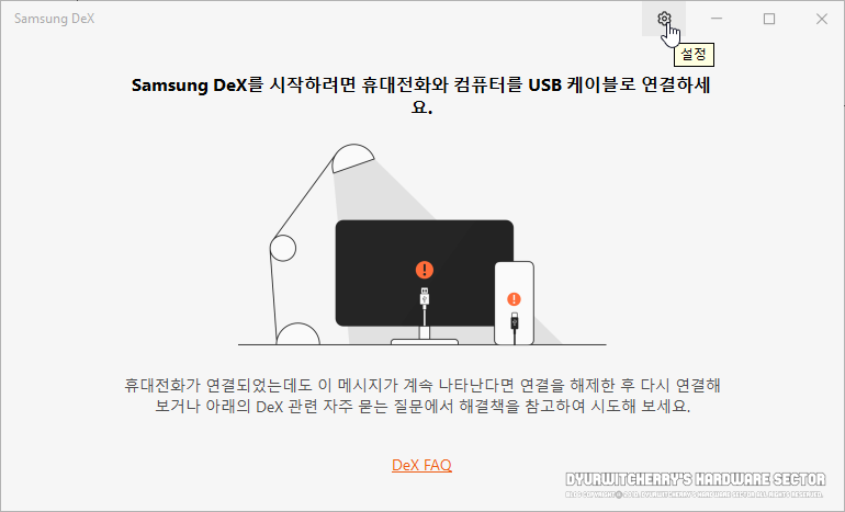 삼성 덱스 스마트폰 알림 설정을 해제하기 위해서 먼저, SAMSUNG DeX 프로그램을 실행한 후 상단 우측의 '⚙' 설정 아이콘을 클릭합니다.