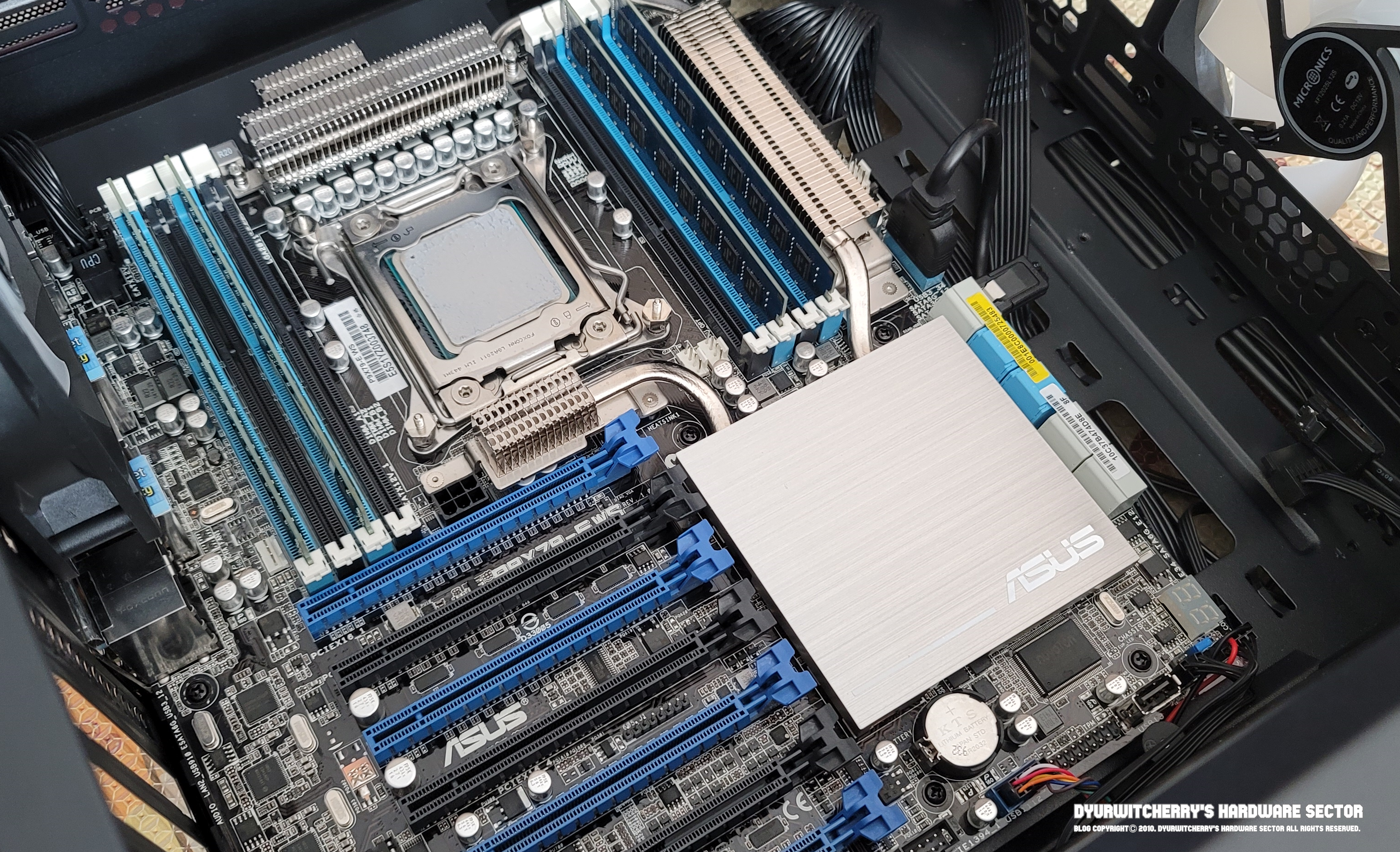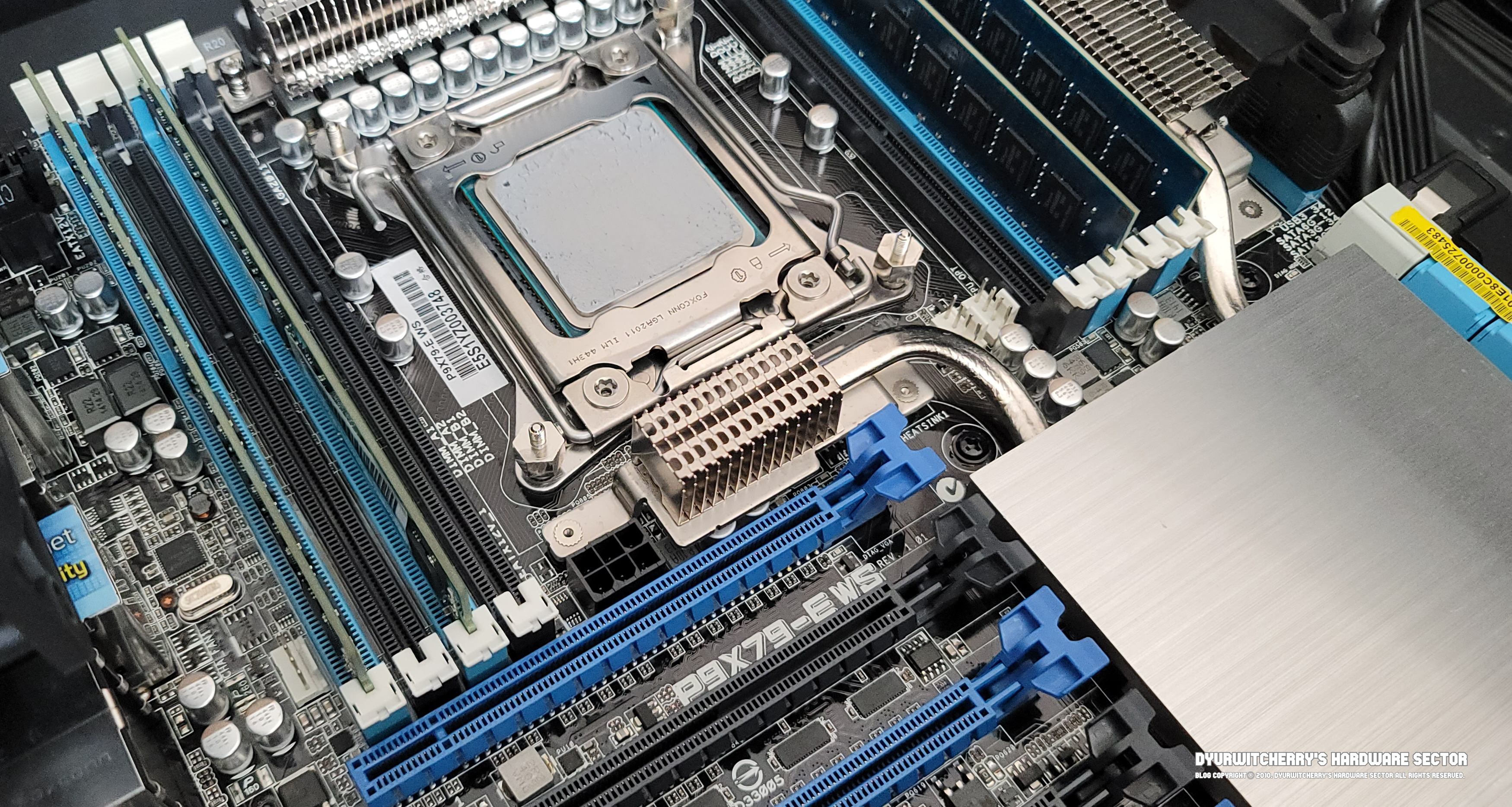 ASUS P9X79-E WS 워크스테이션 메인보드의 가장 큰 특징은 PCI Express 3.0 x16 슬롯 7개와 함께 인텔 X79 칩셋의 커다란 방열판으로, CPU 전원부에 디지털 파워 페이즈 8 + 2페이즈, DDR3 메모리 전원부에 디지털 페이즈 2 + 2 페이즈 등 메인보드에서 발열이 심한 전원부에도 날개형 방열판과 함께 냉각을 위한 파이프라인이 연결되어 있습니다.