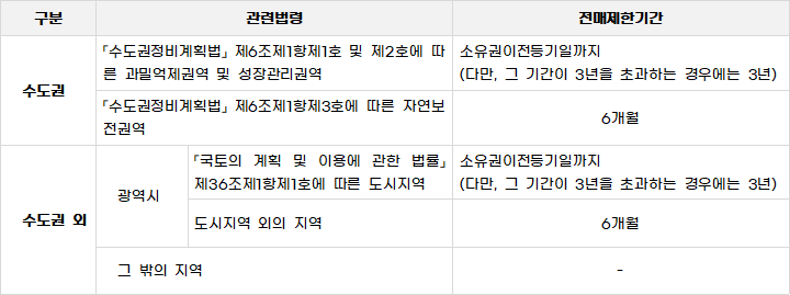 그 외에 「수도권정비계획법」 제6조제1항제1호 및 제2호에 따른 과밀억제권역 및 성장관리권역에 해당하는 수도권 지역과 「국토의 계획 및 이용에 관한 법률」 제36조제1항제1호에 따른 도시지역인 광역시의 경우 소유권이전등기일까지 전매제한이 적용되고, 그 기간이 3년을 초과하는 경우에는 3년의 전매제한 기간이 적용 됩니다.