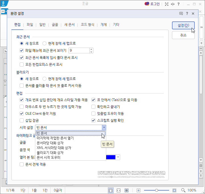 *한글 시작 시 문서 시작 도우미에서 새문서로 바로 빈문서 실행하는 방법