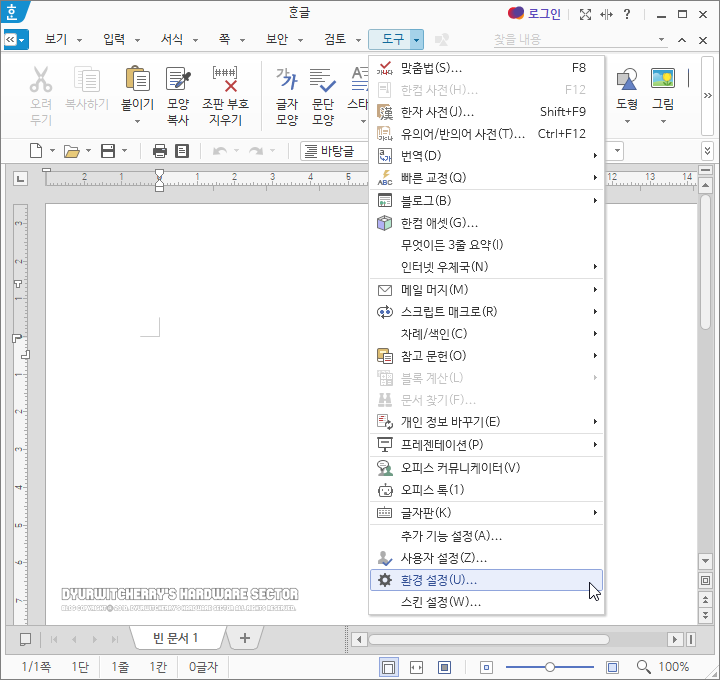 한컴오피스 한글 프로그램 시작 시 최근에 작업하여 저장한 마지막에 작업한 문서로 바로 실행 하도록 설정하는 방법은 먼저, 한글 프로그램을 실행 한 후 상단 메뉴의 '도구 ▼'의 하단 콤보 버튼을 눌러 '☼ 환경 설정(U)...'를 선택 합니다. 참고로 포스팅 작성은 한컴오피스 한글 2020 버전을 기준으로 작성하는 것으로, 최신 버전인 한컴오피스 2022나 구버전인 2018 버전 등에 따라 세부 항목의 차이는 있으나 기본적인 설정은 동일하게 할 수 있습니다.
