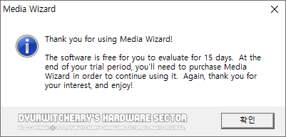 CDH Media Wizard 5.01 버전을 실행하면, 'Thank you for using Media Wizard!'와 함께 15일간 트라이얼 버전으로 사용할 수 있다는 메시지가 나타나며, 확인 버튼을 누르면 프로그램이 실행 됩니다. 참고로 상단의 첨부파일은 설치 파일로 라이선스 코드는 포함되어 있지 않습니다.