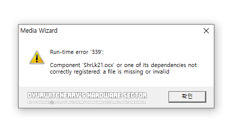 윈도우 98/Me 호환 모드를 적용하지 않고 CDH Media Wizard 5.0 설치 마지막 1초를 남기고 진행이 멈추거나, 설치가 되더라도 프로그램을 실행하면, Rrun-time error '339': Component 'ShrLk20.ocx' 오류가 발생하게 됩니다. ShrLk20.ocx 파일은 기본적으로 32비트 윈도우의 'C:\Windows\System32' 폴더 내에 위치해 있는데, 만약을 대비하여 첨부합니다.