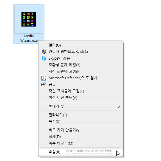 윈도우 10 프로 64비트에서 구버전 멀티미디어 프로그램 CDH Media Wizard 5.01 버전을 실행하기 위해서는 먼저, 프로그램 기본 설치 경로인 'C:\CDH Productions\Media Wizard' 폴더 내 'Media Wizard.exe' 파일에 마우스 오른쪽 버튼을 눌러 '속성(R)'을 선택합니다.