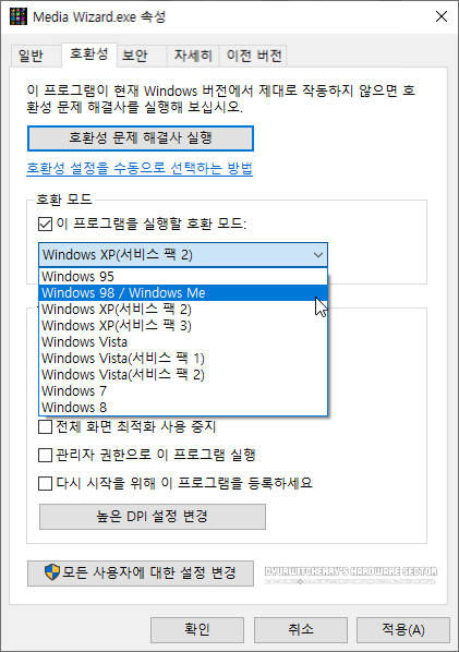 Media Wizard.exe 속성 창이 활성화 되면, 상단의 호환성 택의 호환 모드에서 '☑ 이 프로그램을 실행할 호환 모드:'를 체크하고, 기본값에 선택되어 있던 'Windows XP(서비스 팩 2)'에서 'Windows 98 / Windows Me'로 변경한 후'적용(A) - 확인' 버튼을 눌러 호환모드를 변경한 다음 실행하면 됩니다.