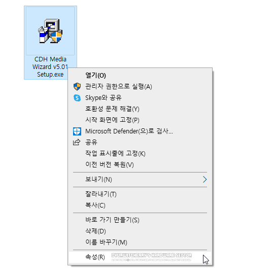 윈도우 9x와 2k 버전에서 사용할 수 있는 멀티미디어 프로그램 CDH Media Wizard 5.01 구버전을 윈도우 10에서 설치하기 위해서는 설치파일 크기 14.02MB의 첨부 파일을 다운로드 받아 '*.exe'실행 파일에 마우스 오른쪽 버튼을 눌러 속성(R)을 선택 합니다.