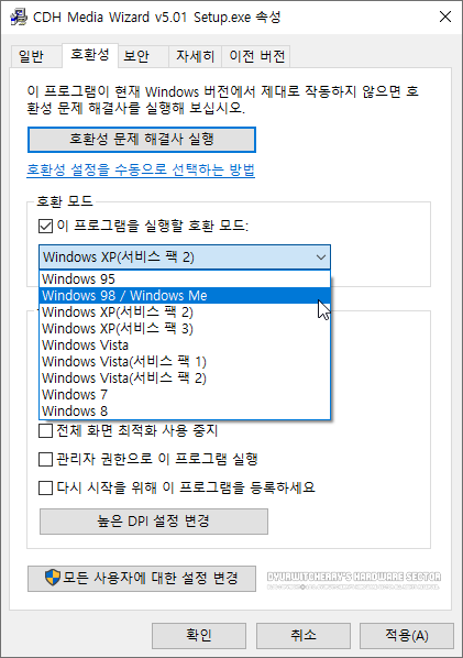 CDH Media Wizard v5.01 Setup.exe 속성 창이 활성화 되면, 상단의 호환성 택의 호환 모드에서 '☑ 이 프로그램을 실행할 호환 모드:'를 체크하고, 기본값에 선택되어 있던 'Windows XP(서비스 팩 2)'에서 'Windows 98 / Windows Me'로 변경한 후'적용(A) - 확인' 버튼을 눌러 호환모드를 변경한 다음 설치하면 됩니다.