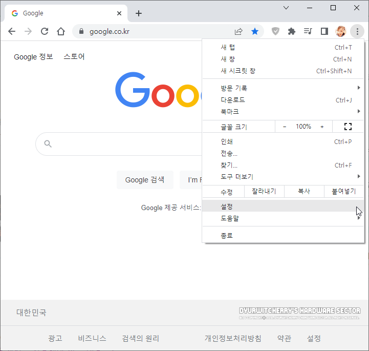 크롬 브라우저를 사용하여 인터넷 웹 서핑을 하는 경우에 윈도우 화면 우측 하단에 특정 사이트의 알림 광고가 나타나는 경우에 광고를 차단하기 위해서는 먼저 chrome 우측 상단의 '⋮' 메뉴 버튼을 눌러 '설정'을 선택 합니다.
