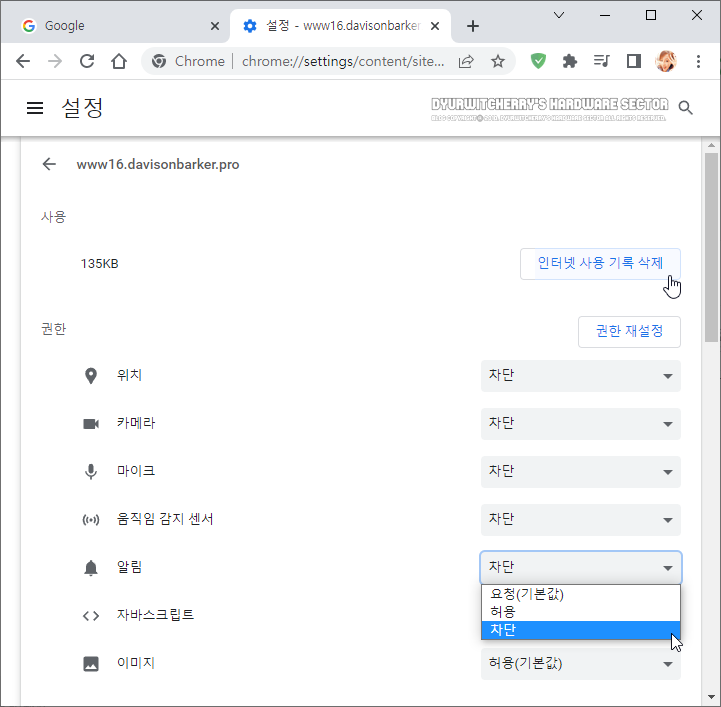 크롬 사이트 설정에서는 위치와 카메라, 마이크와 움직임 감지 센서, 알림과 자바스크립트, 이미지 등의 권한을 '요청' 또는 '허용', '차단' 중에서 '▼' 하단 콤보 버튼을 눌러 선택할 수 있으며, '인터넷 사용 기록 삭제'와 함께 chrome 알림 창이 나타나는 것과 관련 된 항목을 모두 '차단'으로 변경합니다.