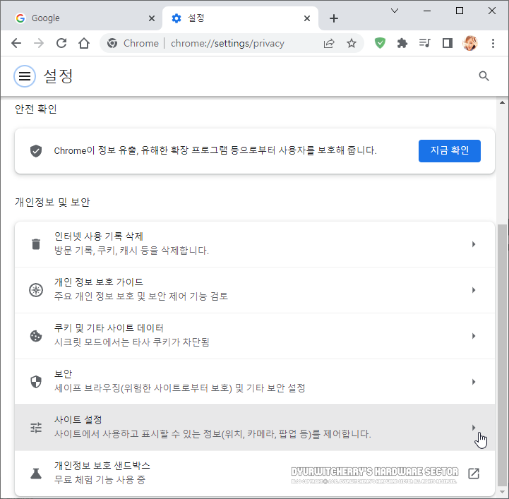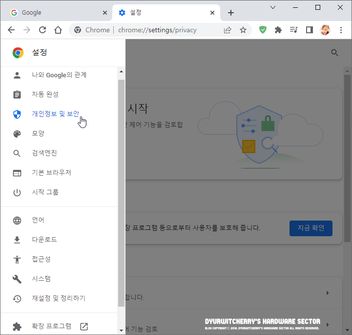크롬 브라우저 설정 메뉴(chrome://settings/)에서 '개인정보 및 보안' 항목을 선택합니다. 참고로 포스팅 시 가독성 향상을 위해 chrome 화면을 축소 시킨 것으로 전체화면에서는 보다 빠르게 작업 할 수 있습니다.