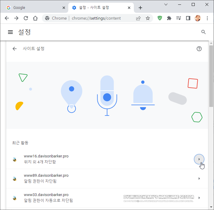 크롬 사이트 설정의 최근 활동 등의 항목을 보면 앞서 chrome 알림 광고가 팝업 창으로 윈도우 화면 우측 하단에 나타났던 'www16.daisonbarker.pro', 'www89.daisonbarker.pro', 'www33.daisonbarker.pro',... 등 알림 권한, 위치 등의 권한 설정을 위해 우측 '▶' 콤보 버튼을 클릭합니다.