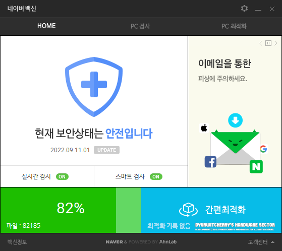 네이버 백신 간편검사는 빠르게 진행되며, 포스팅 작성에 활용한 윈도우 10 프로 64비트 시스템의 메모리와 C: 드라이브 등 바이러스가 주로 감염되는 영역의 검사 진행률 82%에 검사 파일이 82,185개로 약 100,000개 정도의 파일을 검사합니다.
