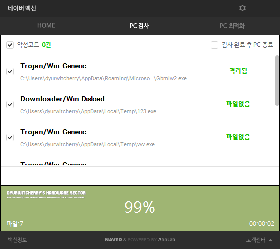 네이버 백신 간편 검사 시에도 대부분의 바이러스와 악성코드를 찾아 낼 수 있는데, 마이크로소프트 디펜더(Microsoft Defender)를 켜고 치료 및 삭제(격리)를 시도한 시점이라 검사 결과 악성코드가 검출 되지는 않았습니다. 검사 시간은 약 2분 정도 소요되었습니다.