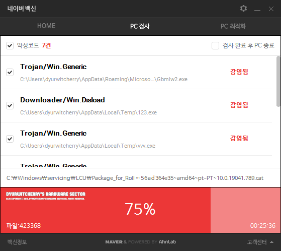 네이버 백신(NAVER Antivirus) 선택검사 버튼을 눌러 검사가 시작되자 마자 진행율 35% 정도 내에서 악성코드 7개가 검색 되었습니다. 포스팅을 위해 마이크로소프트 디펜더(Microsoft Defender)의 실시간 감시 기능을 끄고 구글 검색을 통해 웹에서 의심 파일을 다운로드 받아 실행 후 네이버 백신 검사를 진행 하여 검사시간 외에 간편검사와 직접비교는 어렵습니다.