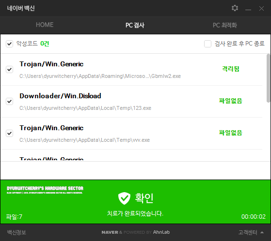 네이버 백신 바이러스 검사 결과 'Trojan/Win.Generic', 'Downloader/Win.Disload' 등의 악성코드 치료에는 약 2초가 소요되었고, 사용자의 키보드 정보 등을 탈취하는 트로이목마로 의심되는 'Gbmlw2.exe' 파일은 격리, 임시 폴더인 Temp 폴더 내 '123.exe'와 'vvv.exe' 등은 파일없음 등으로 결과가 나왔습니다.