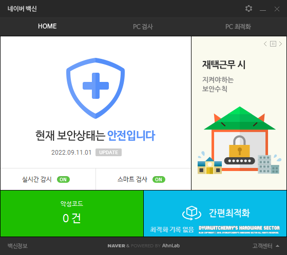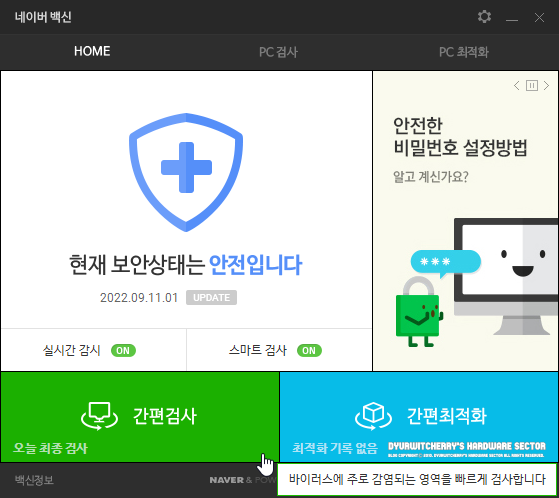 네이버 백신(NAVER Antivirus) 바이러스 간편검사는 프로그램 HOME 메인 화면 창 좌측 하단의 '간편검사' 메뉴 탭을 선택하면, 바로 검사가 진행되고 바이러스에 주로 감염되는 영역을 빠르게 검사합니다. 참고로 테스트를 진행하기 위해 마이크로소프트 디펜더를 끄고 구글 검색을 통해 악성코드나 바이러스 의심파일을 다운로드 받아 실행하고, 다시 Microsoft Defender를 켜고 1차 치료를 한 상태에서 간편검사를 진행하였습니다.