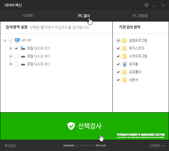 네이버 백신 바이러스 선택검사는 프로그램 상단의 'PC 검사' 탭을 선택한 후 검사 영역 설정에서 '☑ MY PC'의 전체를 체크하거나 윈도우가 설치되어 있는 '☑ 로컬 디스크 (C:)', 사용자 시스템에 따라 '☑ 로컬 디스크 (D:), ☑ 로컬 디스크 (E:) ...'를 체크하고, 기본 검사항목에 필수 항목인 '☑ 실행프로그램' 외에 '☑ 레지스트리'와 '☑ 시작프로그램', '☑ 휴지통'과 '공유폴더', '☑ 내문서' 등 폴더 항목을 체크합니다.