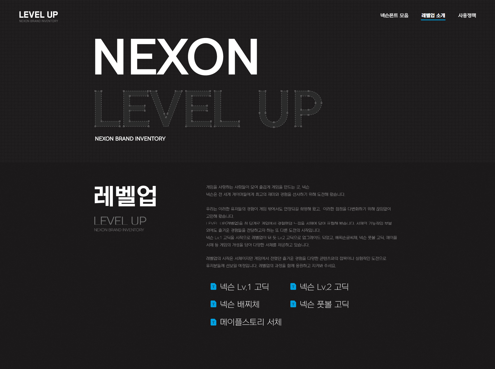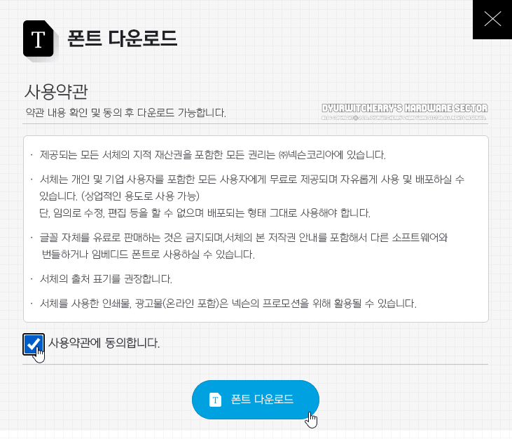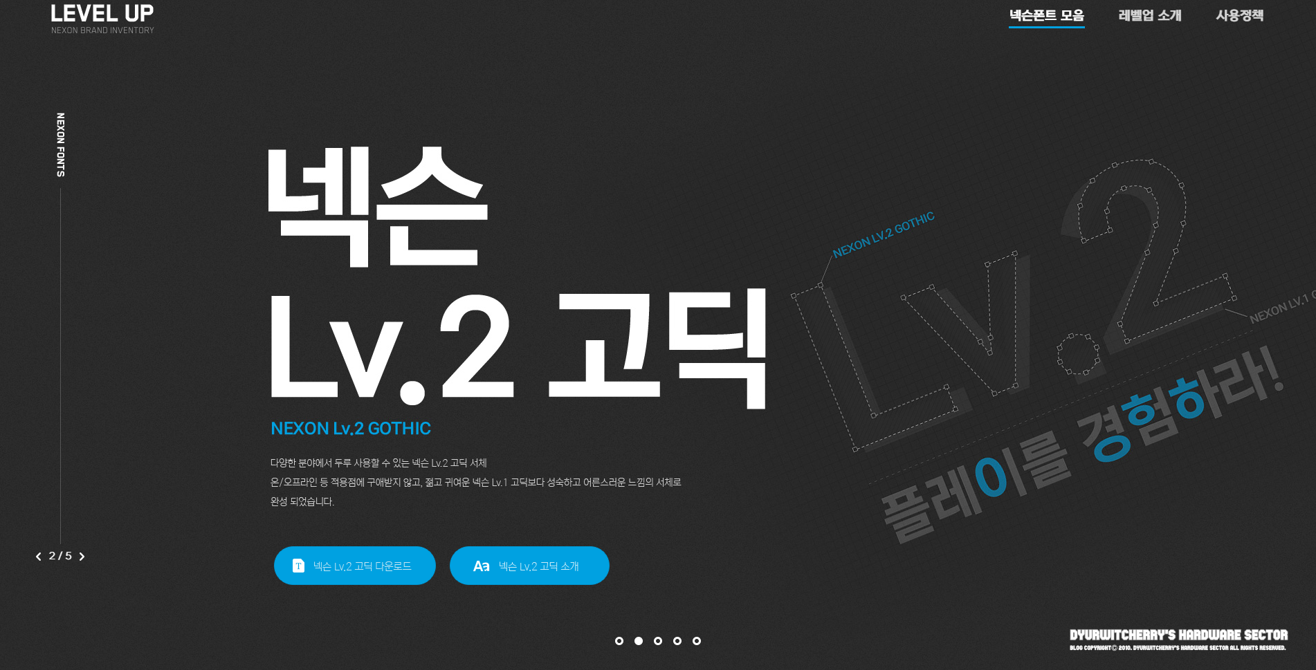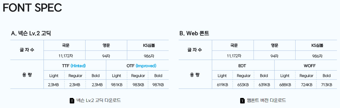 상업적인 용도로도 무료로 사용 가능한 넥슨 폰트 NEXON Lv2 고딕은 'NEXON LEVEL UP (레벨업) – 넥슨 브랜드 인벤토리' 페이지에서 '☑ 사용약관에 동의합니다.'에 체크한 후 '폰트 다운로드' 버튼을 눌러 다운로드 받을 수 있으며, 포스팅에 첨부한 파일크기 약 8.49MB인 위 첨부파일 'NEXON Lv2 Gothic total.zip' 파일을 다운로드 받아 설치하면 됩니다.
