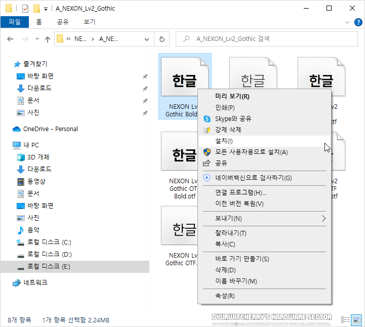 넥슨 폰트 설치하는 방법은 압축을 푼 폴더 내 한글이나 워드 등 문서작업에 적합한 'TTF(True Type Font): 트루타입 글꼴'이나 어도비 제품 군 등의 그래픽 작업에 사용하는 'OTF(Open Type Font): 오픈타입 글꼴' 중 선택하여 마우스 오른쪽 버튼을 눌러 '설치(I)'를 선택하면 바로 설치가 됩니다.