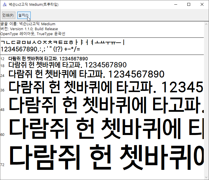 넥슨 Lv.2 고딕 중 'Bold'와 'Medium', 'Light' 등의 글꼴을 더블클릭하면 글꼴 이름과 버전, 오픈타입 레이아웃과 트루타입 윤곽선 등을 확인할 수 있으며, 상단의 '설치(I)' 버튼을 누르면, 'C:\Windows\Fonts' 경로에 넥슨 폰트가 설치 됩니다.