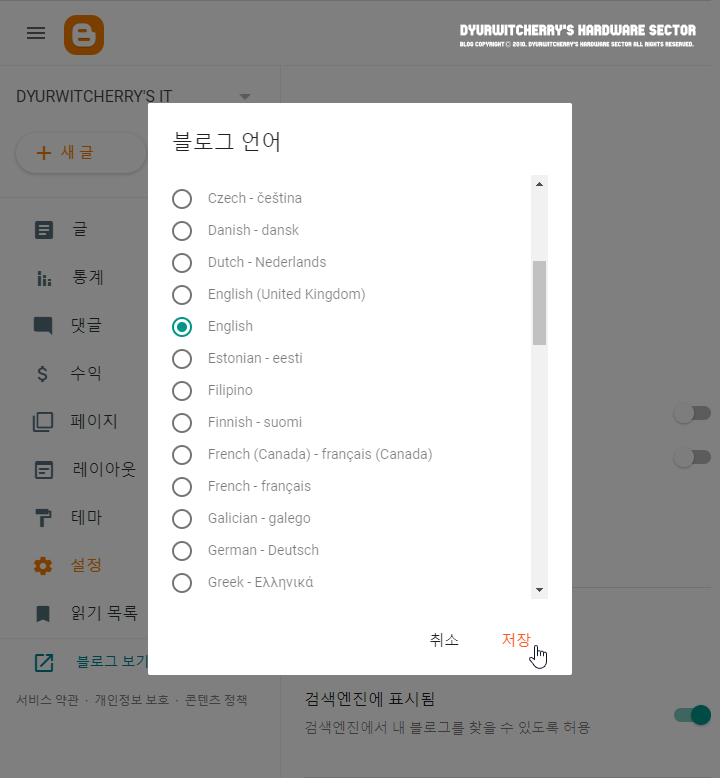 구글 블로그 언어 설정에서 기본언어(한국어)를 선택하면, 블로그 언어 화면 창이 활성화 되며, 우측의 스크롤바를 이용하여 언어선택 '◉ English' 또는 원하는 국가의 언어의 라디오 버튼을 체크하고 저장 버튼을 누르면 됩니다.