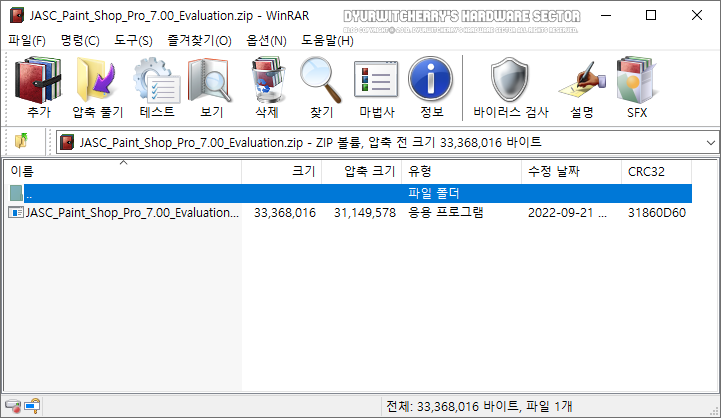 페인트 샵 프로 구버전인 JASC Paint Shop Pro 7.00 버전 평가판은 첨부파일의 파일크기 11.71MB인 'JASC Paint Shop Pro 7.00 Evaluation.zip' 파일과 18.00MB인 '*.z01' 분할압축 파일 2개를 다운로드 받아 ALZip이나 Bandizip, WinZip이나 WinRAR 등의 압축 해제 프로그램을 이용하며 압축을 풀면, 파일크기 약 31.1MB의 'JASC Paint Shop Pro 7.00 Evaluation.exe' 30일 평가판 설치 파일이 생성 됩니다.