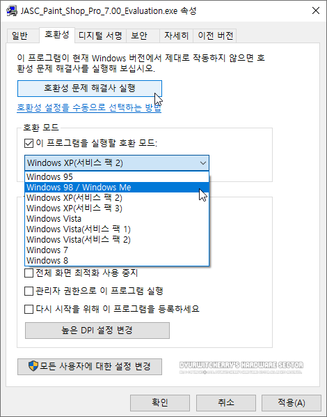 페인트 샵 프로 7 구버전 윈도우 10에 설치하는 방법은, Paint Shop Pro v7.0 설치 파일에 마우스 오른쪽 버튼을 눌러 속성 창이 활성화 되면, 호환성 탭의 호환 모드에서 '☑ 이 프로그램을 실행할 호환 모드:'에 '☑' 체크를 하고, 'Windows 98 / Windows Me'를 선택한 다음 '적용(A)' 버튼을 누른 후 설치하면 됩니다.