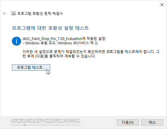 프로그램 호환성 문제 해결사에서 권장 설정 시도를 선택하면, 화면이 프로그램에 대한 호환성 설정 테스트로 변경되고, '프로그램 테스트...' 버튼을 클릭하면, 앞서 실행을 시도했던 'Paint Shop Pro 7' 설치 파일이 윈도우 10에서 실행 됩니다. 참고로 프로그램 테스트에서 설치 파일이 실행되지 않는 경우에는 설치 시도를 다시하면 됩니다.