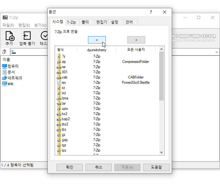 세븐집의 '도구 - 옵션'을 선택하여 옵션 창이 활성화 되면, 상단의 '시스템' 탭의 '7-Zip으로 연결:'의 '+' 추가 버튼을 눌러 '7z, ZIP, gzip, bzip2, tar, CAB, RAR, ARJ, Z, LHA, cpio, smzip, JAR 등의 압축 파일 타입과 CD와 DVD 이미지 파일인 'ISO' 형식을 윈도우 10 테마가 적용 된 압축 아이콘으로 변경됩니다.