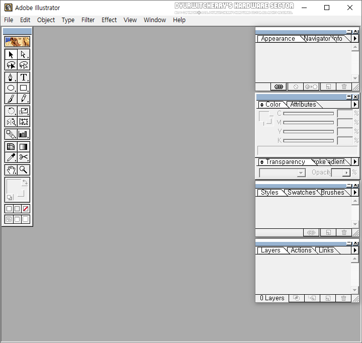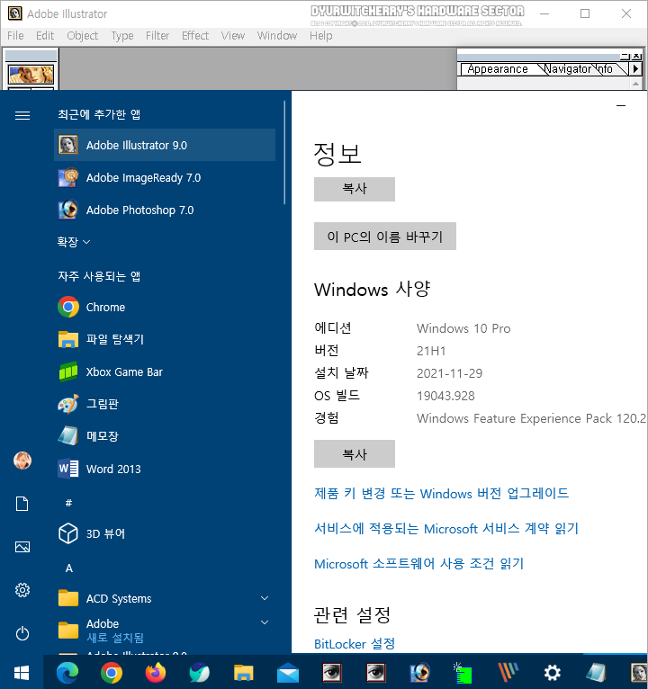 윈도우 10에 어도비 일러스트레이터 9.0 구버전을 설치한 다음 실행한 화면으로, 시스템 정보의 Windows 10 Pro, 에디션 21H1, 설치 날짜 2021-08-19, OS 빌드 19043.2006이 설치되어 있는 PC에서는 Adobe Illustrator 9.0 버전이 호환 모드로도 설치할 수 없었는데, MacBook Air Early 2014에 부트캠프로 설치한 동일한 버전의 윈도우 10에서는 설치가 되었습니다.
