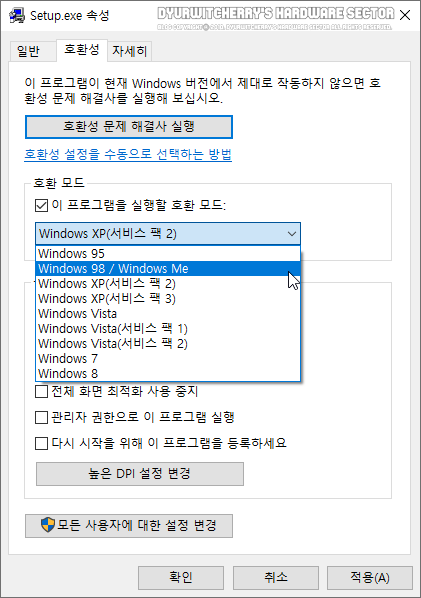어도비 일러스트레이터 9.0 구버전을 윈도우 10 프로 64비트 시스템 등에 설치하기 위해서는 설치 파일인 'Setup.exe' 파일에 마우스 오른쪽 버튼을 눌러 속성 창이 활성화 되면, 호환성 탭의 호환 모드에서 '☑ 이 프로그램을 실행할 호환 모드:'에 '☑' 체크를 하고, 'Windows 98 / Windows Me'를 선택한 다음 '적용(A)' 버튼을 누른 후 설치하면 됩니다