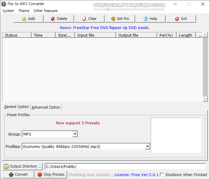 FLAC MP3 변환 프로그램 FLAC to MP3 Converter는 FLAC(Free Lossless Audio Codec, /ˈflæk/) 무손실 오디오 데이터 압축을 위한 파일 형식을 상대적으로 파일 크기가 작은 MP3 파일 포맷으로 변환하는 프로그램으로, 프리버전의 경우 한번에 1개의 파일만 변환 작업을 할 수 있습니다. 제작사에서는 현재 FLAC to MP3 Converter 추가 개발을 하지 않는 단종 프로그램을 FLAC to MP3 Converter 2.0.1 버전이 마지막 버전이며, 기본 테마 외 클래식 등 5가지 테마를 지원하고, 'other freeware' 탭에서 현재 개발하고 있는 프리웨어 프로그램을 다운로드 할 수 있습니다.