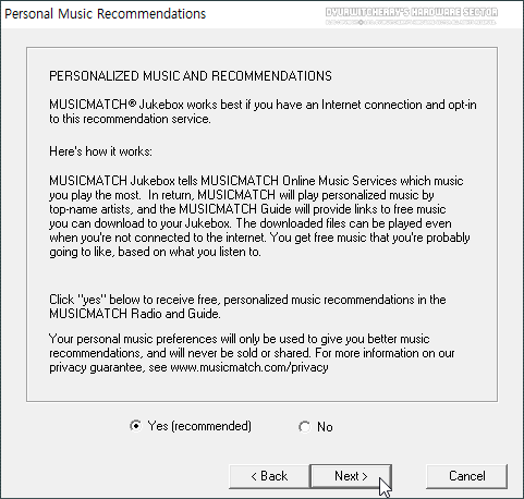 Personal Music Recommendations 단계, 개인 음악 추천의 '◉ Yes (recommended)' 또는 '◉ No'의 라디오 버튼을 '◉' 체크하고 하단의 'Next >' 버튼을 클릭합니다.