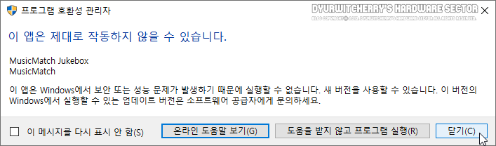 참고로, 윈도우 10 프로 64비트 업데이트 1015 릴리즈 버전에서는 MusicMatch Jukebox 10.00.4033 최종 버전을 설치하여 사용할 수 있지만, Windows 10 Pro 64-bit 21H1(OS 빌드 19043.2006) 등의 윈도우 업데이트 이후에는 설치 파일 실행 시 자동으로 프로그램 호환성 관리자가 실행되어 호환 모드로 설치가 진행 되지만, 설치 완료 후 로고 화면은 나타나지만 실행이 되지 않습니다.