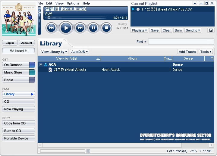 뮤직 매치 주크박스 10.00.4033 버전에서 "*.MP3' 파일을 재생중인 화면으로, 2바이트 문자인 한글과 특수문자도 정상적으로 표시가 되며, 뮤직 스토어와 라디오 메뉴는 사용할 수 없지만, CD 재생과 CD 복사 및 레코딩 등의 기능은 사용할 수 있습니다. 참고로 MusicMatch Jukebox는 셰어웨어로 라이선스 코드를 입력하면, MusicMatch Jukebox Plus 버전으로 전환되어 48배속 이상의 CD 굽기와 베이직 버전 대비 10배 속도의 CD 리핑, CD 라벨 프린팅 등의 기능이 추가 됩니다.