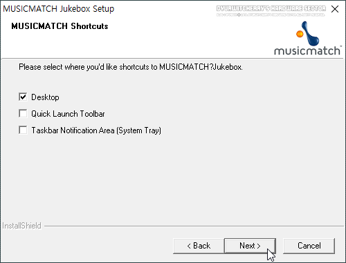 MUSICMATCH Shortcuts에서 디폴트 값으로 '☑ Desktop'과 '☑ Quick Lanch Toolbar', '☑ Taskbar Notification Area (System Tray) 등이 모두 '☑' 체크 되어 있어, 바탕화면 아이콘과 빠른실행 아이콘, 시스템 트레이에 시작프로그램 등록 등 필요하지 않은 항목은 '□' 체크 해제하고 'Next >' 버튼을 클릭합니다.