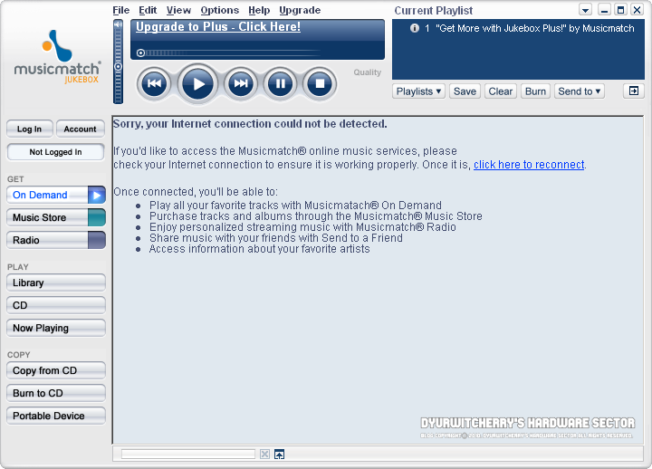MusicMatch Jukebox 10.00.4033 최종 버전 설치가 완료되면, 튜토리얼 화면과 함께 프로그램이 실행되며, 'Upgrade to Plus - Click Here! "Get More with Jukebox Plus!" by Musicmatch' 플러스 버전 안내 화면이 라이브러리 영역에 활성화 됩니다. 참고로 'click here to reconenect' 링크를 클릭하여도 인터넷 웹 브라우저에서 해당 링크가 열리지는 않습니다.