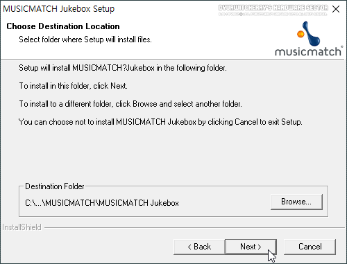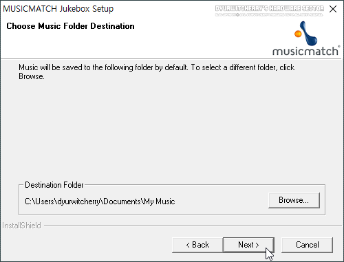 뮤직 매치 주크박스 기본 설치 경로는 'C:\Program Files\MUSICMATCH\MUSICMATCH Jukebox'이며, 경로 변경을 하지 않는 경우에는 'Next >' 버튼을 클릭합니다.