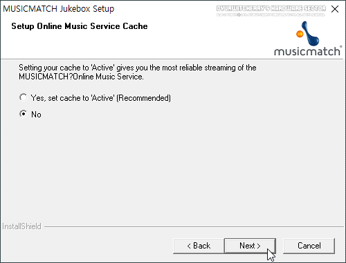 온라인 뮤직 서비스 캐시 사용 여부를 확인하는 단계에서 기본 값으로 '◉ Yes, set cache 'to 'Active'(Recommended)' 감이 선택되어 있으며, 현재는 정상적인 서비스 이용이 어렵기 때문에 '◉ No' 값으로 라디오 버튼을 선택하고 'Next >' 버튼을 클릭합니다.