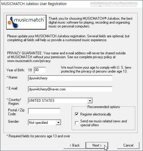 MUSICMATCH Jukebox User Registration 단계에서 '*' 필수 항목인 '*Name:'과 'E-mail:', '*Country/Region:' 항목을 선택 입력하고, 'Next >' 버튼을 클릭하면 되는데, 뮤직 매치 주크박스는 만 13세 이상이 이용할 수 있기 때문에 'Year Birth: 19' 입력 필드에 적당한 숫자 값을 입력하면 됩니다.
